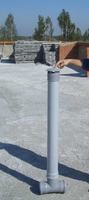 Следующее и гораздо более чаще принимаемое решение состоит в монтаже труб для отвода пара "флюгарки" из термоизоляционного слоя, которые распределяются по всей поверхности кровли. Между тем, в практике существует проблема точного расчета расстояния между "флюгарками", учитывая, что основным условием при их проектировании является требование, чтобы сопротивление горизонтально движению пара через термоизоляционный слой на расстояние (которое измеряется в метрах), было меньше сопротивления при вертикальном движении пара через слой термоизоляции по ее толщине (которая измеряется в сантиметрах), увеличенным за адгезию гидроизоляционного слоя к основанию, и это всё в зависимости от температуры воздуха, действия прямых солнечных лучей, атмосферного давления, влажности воздуха и т.п. При этом наиболее частые разрушения, которые появляются у таких систем защиты паропроницаемой гидроизоляции от воздействия пара из термоизоляционного слоя, происходят по двум основным причинам (включая все вытекающие из этого последствия):